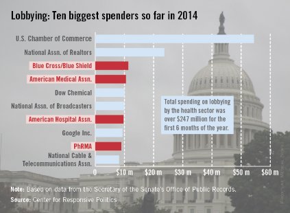 Four of the 10 largest spenders on lobbying for the first 6 months of 2014 are part of the health sector, the Center for Responsive Politics reported.