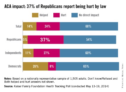 Among Republicans, 37% say that they have been hurt by the health reform law and 5% say that they have been helped. The numbers were basically reversed for Democrats, with 26% saying that they have been helped and 8% reporting that they been hurt. Independents lean more toward the Republicans, with 27% saying that they have been hurt and 11% saying that they have been helped, Kaiser reported in its latest Health Tracking Poll.