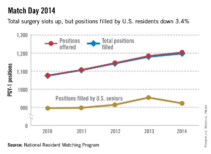 A total of 1,205 surgery slots were offered for 2014, compared with 1,180 in 2013. Of the available slots, 99.4% (1,198) were filled, with 76.5% (922) going to U.S. seniors. The number of U.S. seniors was 954 last year, for a fill rate of 80.8%, according to the NRMP.