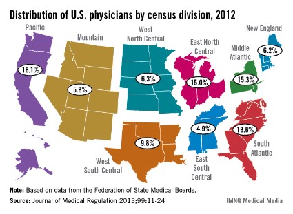 The South Atlantic also had the largest physician population of any census division in 2012 – 163,319 (18.6%) of the 878,194 doctors with an active license, said Aaron Young, Ph.D., of the FSMB in Euless, Tex., and his associates (J. Med. Regul. 2013;99:11-24).
