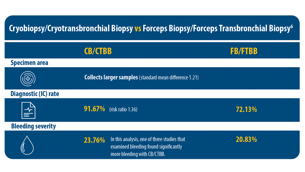 6. Ganganah O, Guo SL, Chiniah M, Li YS. Efficacy and safety of cryobiopsy versus forceps biopsy for interstitial lung diseases and lung tumours: a systematic review and meta-analysis. Respirology. 2016;21(5):834-841. doi:10.1111/resp.12770