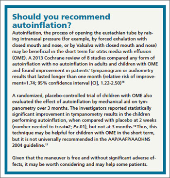 There are several management options to choose from, including watchful waiting, medication, and/or surgery. (Another option, autoinflation, which has shown some short-term benefits, is described in “Should you recommend autoinflation?”17-19.)