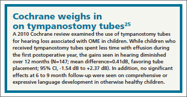 25. Browning GG, Rovers MM, Williamson I, et al. Grommets (ventilation tubes) for hearing loss associated with otitis media with effusion in children. Cochrane Database Syst Rev. 2010;(10):CD001801.