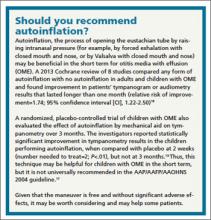 18. Perera R, Glasziou PP, Heneghan CJ, et al Autoinflation for hearing loss associated with otitis media with effusion. Cochrane Database Syst Rev. 2013;5:CD006285.