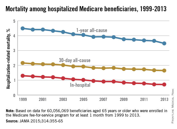 Over that time period, in-hospital mortality declined from 1.3% to 0.71%. Meanwhile, 30-day mortality declined from 2.16% in 1999 to 1.65% in 2013 and 1-year mortality slipped from 4.49% to 3.48% among 60,056,069 individuals aged 65 years or older who were enrolled in a Medicare fee-for-service plan for at least 1 month over the study period, reported Dr. Harlan M. Krumholz of Yale University in New Haven, Conn., and his associates.
