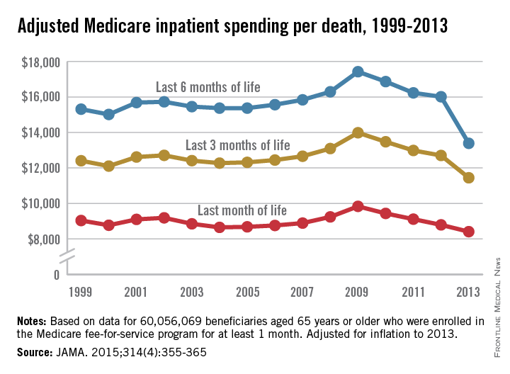 After adjustment for inflation, the average inpatient cost for patients aged 65 years and older who died was over $17,400 in 2009. By 2013, Medicare spending in the last 6 months of life had dropped to just under $13,400. The trend in spending was similar over the last 3 months of life and over the last month, but the declines – 18% for the last 3 months and 14.5% for the last month – were not as great, reported Dr. Harlan M. Krumholz of Yale University in New Haven, Conn., and his associates (JAMA. 2015;314(4):355-365).
