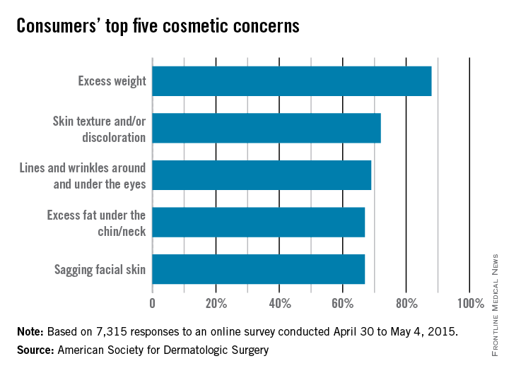 The ASDS asked people to identify their biggest cosmetic concerns, and 88% said that they were somewhat to extremely bothered by excess weight. The next most-concerning condition was “skin texture and/or discoloration” (72%), followed by “lines and wrinkles around and under the eyes” (69%), “excess fat [there it is again] under the chin/neck” (67%), and “sagging facial skin” (67%).
