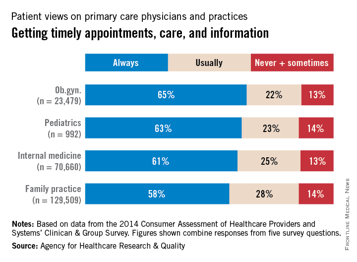 In a composite of five survey questions asking if patients received timely appointments, care, and information, 65% of ob.gyn. patients said that their physicians always provided such care, compared with 63% for pediatricians, 61% for internists, and 58% for family physicians, according to data from the Consumer Assessment of Healthcare Providers and Systems (CAHPS) Clinician & Group Survey.
