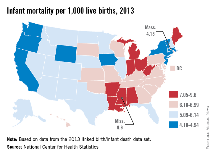 In 2013, infant mortality in Mississippi, the state with the highest rate, was more than twice as high as in Massachusetts, which had the lowest rate, the National Center for Health Statistics reported.