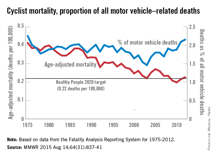 Annual mortality among cyclists for all motor vehicle–related deaths was 0.23 per 100,000 in 2012, a decline of 44% since 1975 when the rate was 0.41 per 100,000. But the rate is up from just under 0.20 per 100,000 in 2010. In 2012, the rate topped the Healthy People 2020 goal of 0.22 for the first time since 2008, according to Jason Vargo, Ph.D., of the University of Wisconsin, Madison, and his associates (MMWR. 2015 Aug 14;64[31]:837-41).