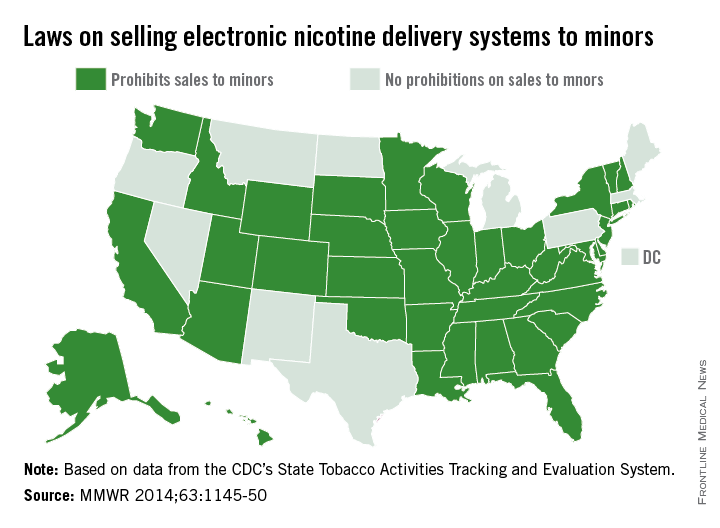 Texas, Pennsylvania, and Michigan are the largest of the 11 states (including the District of Columbia) that allow minors to purchase electronic nicotine delivery systems (ENDS), which include – in addition to e-cigarettes – electronic hookahs, electronic cigars, and vape pens, according to the CDC (MMWR 2014;63:1145-50). ENDS are battery-powered devices that deliver aerosolized nicotine and additives to the user, and “use in public indoor areas might passively expose bystanders” to same.