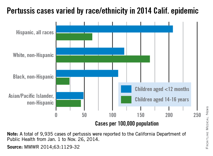 Pertussis incidence was 207 per 100,000 population for Hispanic infants less than 12 months old and 166.2 cases per 100,000 in white 14- to 16-year-olds, compared with an overall incidence of 26 cases per 100,000 for the period from Jan. 1 to Nov. 26, 2014. White, non-Hispanic infants and black infants also had rates over 100 per 100,000, noted Kathleen Winter and her associates of the California Department of Public Health (MMWR 2014;63:1129-32).