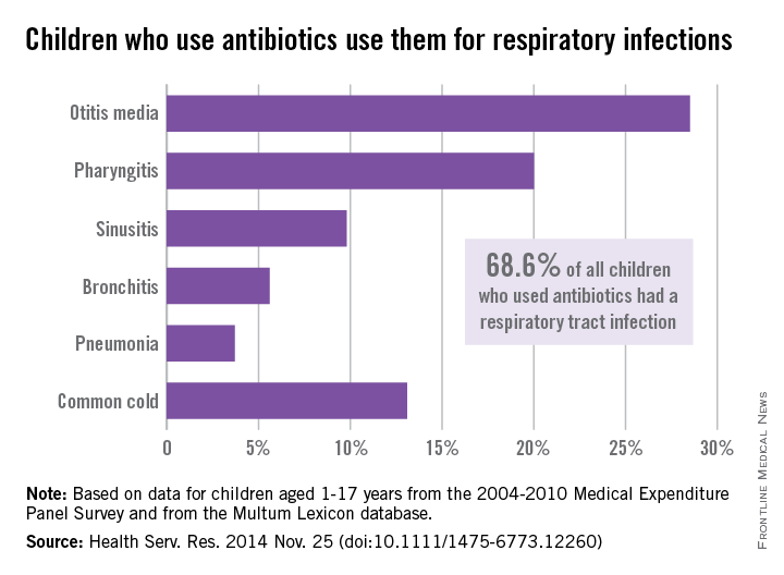 Among the various RTIs, children who got an antibiotic were most likely to have otitis media (28.5%), followed by pharyngitis (20%). “Furthermore, significant proportions of children used antibiotics to treat three conditions – bronchitis (5.6%), sinusitis (9.8%), and the common cold (13.1%) – for which antibiotics are rarely, or never, indicated,” the investigators wrote (Health Serv. Res. 2014 Nov. 25 [doi:10.1111/1475-6773.12260]).