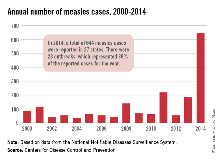 Provisional data show that 644 cases of measles from 27 states in 23 outbreaks were reported to the CDC’s National Center for Immunization and Respiratory Diseases in 2014. The previous postelimination high came in 2011, when 220 cases were reported. The CDC reported that most people that contracted measles were unvaccinated and that travelers with measles continue to bring the infectious disease to the United States.