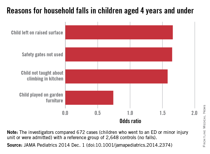 Compared with children who didn’t fall from furniture, those from homes without safety gates were 1.65 times more likely to fall and those not warned about climbing in the kitchen were 1.58 times more likely to end up in an emergency department or minor injury unit or to be admitted to the hospital, reported Dr. Denise Kendrick of the University of Nottingham (England) and her associates (JAMA Pediatr. 2014 Dec. 1 [doi:10.1001/jamapediatrics.2014.2374].