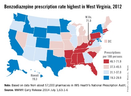 The overall prescribing rate for benzodiazepines in the South for 2012 was 43.1/100 persons – 54% higher than the West’s 27.9/100. Like the South, prescribing rates in the Midwest (38.2/100) and the Northeast (38.1/100) were both above the national rate of 37.6/100 persons, according to the CDC (MMWR 2014 July 1;63:1-6).