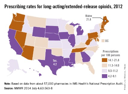 The prescribing rate for long-acting/extended-release opioid pain relievers in Maine, which is the highest in the country, is more than five times higher than that of Texas, which has the lowest rate, the Centers for Disease Control and Prevention reported.