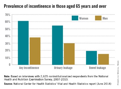 Among noninstitutionalized Americans aged 65 years and older, 61.2% of women and 38% of men experience at least occasional urinary or bowel incontinence, the National Center for Health Statistics reported.