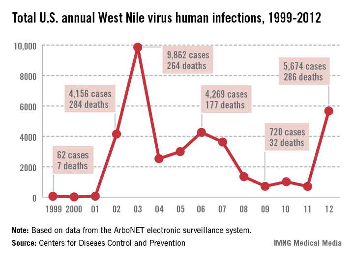 There were 5,674 total cases reported in 2012 – up 697% from 712 in 2011 and the highest since the peak year of 2003, when there were 9,862 cases. The 286 deaths due to West Nile virus that occurred in 2012 were the most in any year in the United States. The previous high was 284 in 2002. The 2,873 cases of neuroinvasive disease also were the highest since 2003, the CDC said.