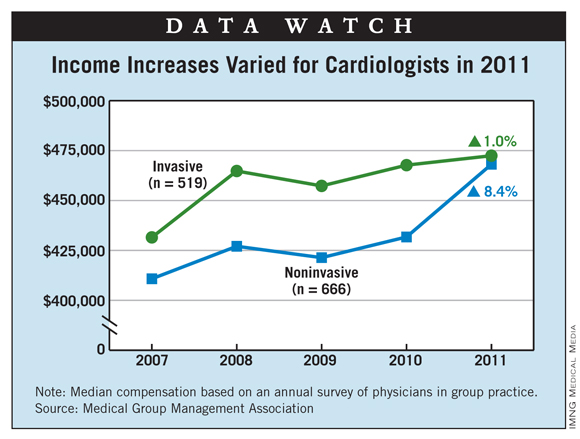 In 2011, the median compensation for the 666 noninvasive cardiologists responding to the survey was $468,136, compared with $431,740 in 2010. The 519 invasive cardiologists had a median income of $472,446 in 2011, compared with $467,715 in 2010, the MGMA reported.