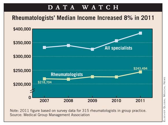 Median compensation for rheumatologists in group practice increased 8% in 2011, according to data from the Medical Group Management Association.