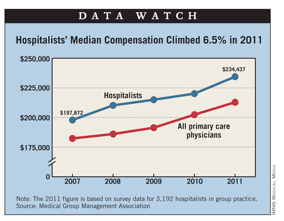Median compensation for hospitalists in group practice increased 6.5% in 2011, according to a survey by the Medical Group Management Association.