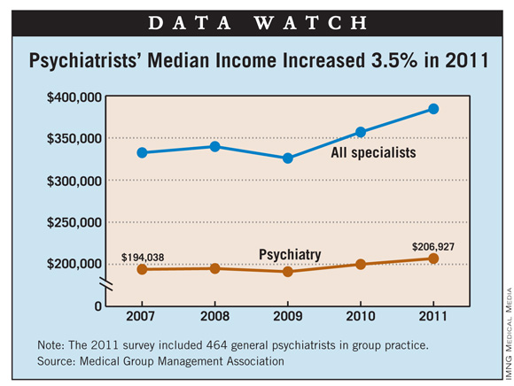 Median compensation for general psychiatrists in group practice increased 3.5% in 2011, according to a survey by the Medical Group Management Association.