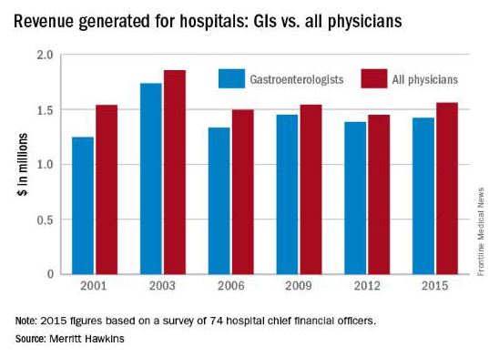 Gastroenterologists generated slightly more revenue for hospitals in 2015 than in 2012, but they remained below the average for all physicians, according to a survey by physician recruitment firm Merritt Hawkins.