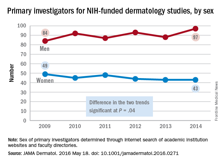 The number of female primary investigators for dermatology studies funded by the NIH dropped from 49 in 2009 to 43 in 2014. Over the same period, the number of men leading NIH-funded dermatology studies rose from 84 to 97, with the difference between the two trends showing statistical significance (P = .04), Dr. Michelle Y. Cheng and her associates reported (JAMA Dermatol. 2016 May 18. doi: 10.1001/jamadermatol.2016.0271).
