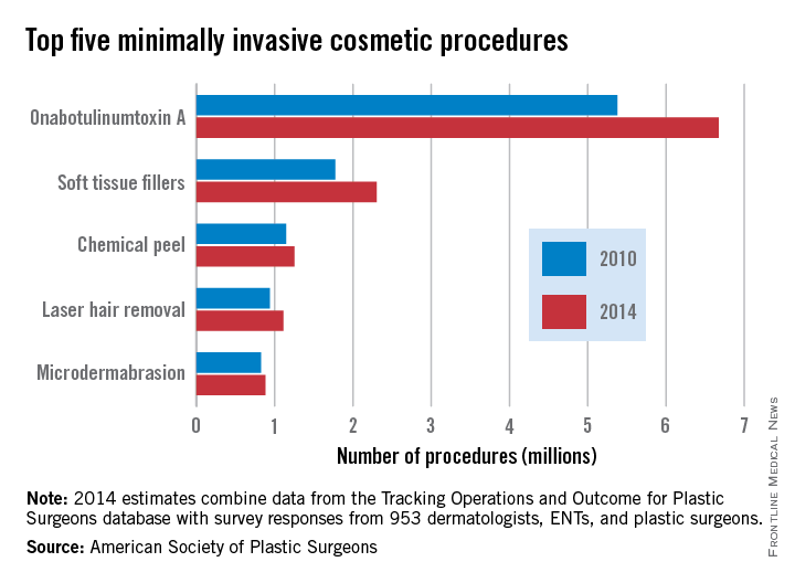 The number of minimally invasive cosmetic procedures increased by well over 2 million from 2010 to 2014, according to a report from the American Society of Plastic Surgeons (ASPS).