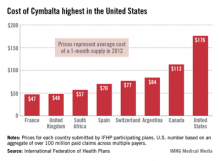 The average price for a 1-month supply of duloxetine (Cymbalta) was $176 in the United States, which is 56% higher than in Canada ($113) and 274% higher than in France, where the cost was lowest at $47, the IFHP said. Duloxetine is used to treat depression, anxiety, and pain.