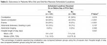 A retrospective review of each patient’s chart was conducted with the assistance of a team of nurse abstractors. Basic demographic data were recorded for each patient. Date of hospital admission and discharge; scheduled laxatives ordered and administered (any dose of sennosides, polyethylene glycol, docusate, bisacodyl, lactulose, or magnesium citrate); abdominal X-rays and abdominal CT scans performed for constipation; and any administration of enemas were recorded. Fiber supplements were not considered laxatives. If a patient was documented to have constipation during their hospitalization this was recorded. Patients were classified as having severe constipation if an abdominal CT or x-ray was performed for the indication of constipation; if abdominal distension, pain, or bloating were documented due to constipation; or if an enema was performed during the hospitalization.