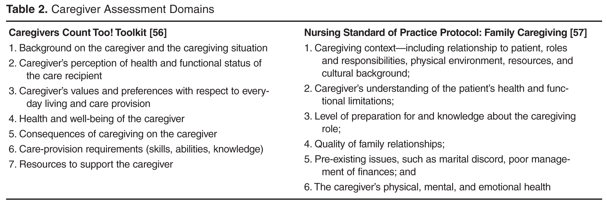 Young et al [58] recommend specific domains for a comprehensive readiness assessment of stroke family caregivers. Caregiver domains include strength of the caregiver/care recipient relationship; caregiver willingness to provide care; pre-existing health conditions, previous responsibilities, caregiving experience, home and transportation accessibility, available resources, emotional response to the stroke, and ability to sustain the caregiving role. This type of readiness assessment should be completed early in the care trajectory, while the stroke survivor is receiving inpatient care, so that care plans can be tailored to address gaps in caregiver preparation prior to discharge. It is especially important for new caregivers and those caring for stroke survivors with significant functional limitations [44]. Currently there are no tools designed to assess a family member’s readiness to assume the caregiver role.