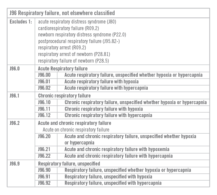 While you can find additional codes in the ICD-10-CM Official Guidelines for Coding and Reporting available at http://www.cms.gov/Medicare/Coding/ICD10/2015-ICD-10-CM-and-GEMs.html that are pertinent to critical care medicine, these codes also serve to reiterate a couple of points. First, in the J96 codes for respiratory failure, you see a number of “Excludes1” codes. Remember that this means that a J96 category code MAY NOT be used if you have also chosen one of the excludes1 codes.