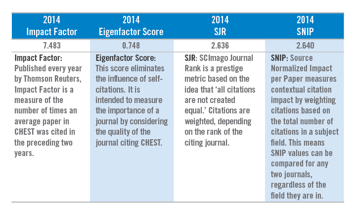 The new Thomson Reuters Journal Citation Report Impact Factor (IF) numbers for this past year were recently released, and we are pleased to announce that the CHEST IF for 2014 has increased from 7.132 to 7.483, once again setting a record for CHEST. In addition, CHEST’s Eigenfactor Score (a measure that eliminates the influence of self-citations) for 2014 is 0.748, which ranks CHEST as 2nd in both the Respiratory and Critical Care categories of the Journal Citation Reports.