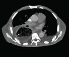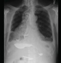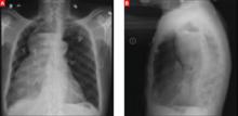 Lab studies showed a normal brain natriuretic peptide of 16 pg/mL, normocytic anemia (hemoglobin, 9.5 g/dL; hematocrit, 29.6%; and a mean corpuscular volume of 82.6 fL), potassium of 2.4 mEq/L, calcium of 5.4 mg/dL, and albumin of 1.4 g/dL. An electrocardiogram (EKG) revealed a bifascicular heart block, which was not new based on older EKGs. A plain chest radiograph was performed (FIGURES 1A AND 1B).