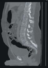 A stat CT of the patient’s abdomen and pelvis revealed no signs of obstructive uropathy to explain his acute renal failure. A sagittal CT reconstruction in bone windows of the initial ED radiological workup was revealing (FIGURE 1).