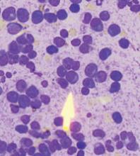 Following inpatient admission, the patient underwent a bone marrow biopsy that showed 90% marrow plasma cells (FIGURE 2). Serum protein electrophoresis (SPEP) and immunofixation electrophoresis revealed an elevated monoclonal protein of 7.52 g/dL IgG kappa, prompting us to diagnose multiple myeloma.
