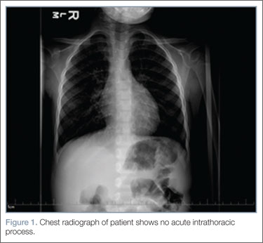 Laboratory evaluation included assessment of sodium, chloride, carbon dioxide, calcium, magnesium, amylase, lipase, and creatine levels; liver function test; complete blood count; and red-cell indices. All of the laboratory values were within normal limits, and urinalysis was negative for infection. Blood and urine cultures were also taken. A chest X-ray showed no acute intrathoracic process (Figure 1).