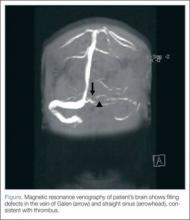 Based on the patient’s history of ET and postpartum state, there was a high suspicion for cerebral venous thrombosis (CVT). Magnetic resonance imaging/magnetic resonance venography (MRI/MRV) of the brain was obtained, which revealed near-complete thrombosis of the vein of Galen and straight sinus (Figure). Neurology and hematology services were consulted emergently, and the patient was started on a heparin drip and admitted to the neurosurgical intensive care unit. Hydroxyurea was also given for cytoreduction, and platelets normalized to 305 x 109/L within 1 day of treatment. The patient’s neurological examination remained nonfocal, her headache gradually resolved, and she was discharged on hospital day 3 on oral anticoagulants.
